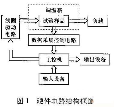 電磁繼電器壽命加速試驗裝置包括試驗控制柜、負載、自動調溫箱(提供加速應力)3部分,其中控制柜由工控機、數據采集控制電路、線圈驅動電路組成,是設計的主要內容。硬件電路結構框圖 如圖1所示。