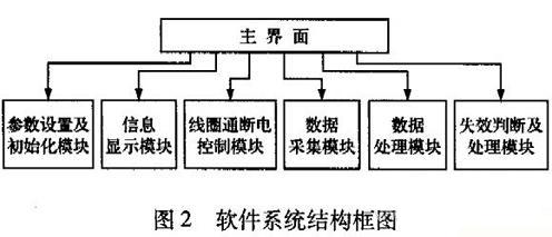 本系統應用軟件由6個功能模塊組成:參數設置及初始化模塊、信息顯示模塊、線圈通斷電控制模塊、數據采集模塊、數據處理模塊、失效判定及處理模塊,其結構框圖如圖2所示。