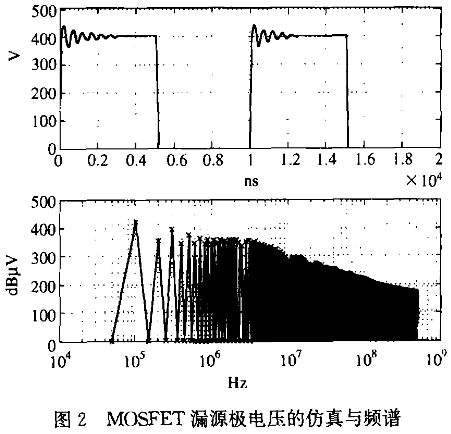 圖1所示是某型號開關電源中MOSFET漏源極的電壓波形,由一個梯形信號和一個阻尼振蕩信號疊加而成,梯形信號的上升時間和下降時間一般在十納秒到一百納秒之間,電壓和電流的變化率很快,而阻尼振蕩信號則成正弦波的指數衰減形式,它的振蕩周期一般為幾十到幾百納秒。由于梯形信號上升沿下降沿的di/dt, dv/dt很大,將產生很強的干擾電壓和電流,這些電壓和電流通過某種耦合方式傳輸到輸入和輸出端口就會形成電磁干擾。在開關電源中,干擾源處的電磁干擾通常具有頻譜范圍廣,干擾強度大的特點。