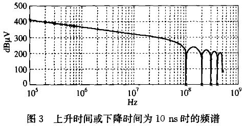 開關信號的上升和下降沿對干擾的幅值影響很大,圖3是上升時間或下降時間為10ns時的上升沿或下降沿的頻譜,把上升時間或下降時間改為100ns再仿真時發現:當上升時間或下降時間增加時,隨著頻率的升高,幅值減小的越快,也就是說,上升或下降時間的變化對高頻干擾幅值影響更大。表1中列出了上升時間或下降時間為10ns和100ns時,不同頻率的電磁干擾幅值和比較結果。從圖中還可以看出在頻率為及其諧波頻率附近,電磁干擾的幅值有一個很大的下降。