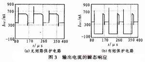 圖3(b)所示曲線的仿真條件與圖3(a)的條件一樣。仿真結果表明當輸出發生短路時(即負載為0),輸出電流被限制為O,即功率MOS管被完全關斷,同時表明系統具有自動恢復的特點,即負載短路消除后,系統恢復正常工作。