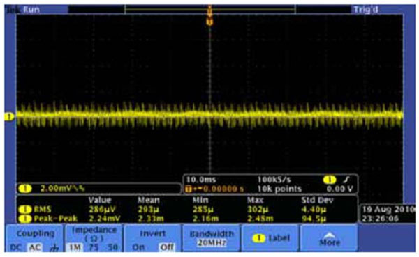 圖6 使用1X探頭和約7MHz帶寬測量噪聲的同時電源提供全額定電流