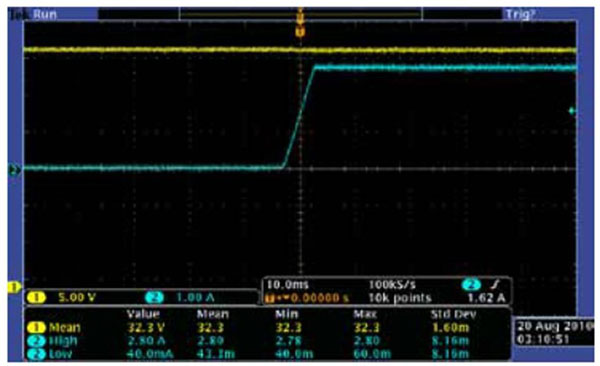 圖4 示波器屏幕顯示了當負載電流從0A變至2.8A時,吉時利2200-32-3的輸出電壓調節。在整個變化過程中,輸出電壓保持穩定