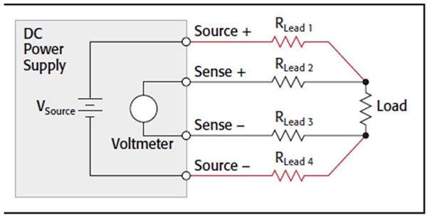 電源與被測器件(DUT)之間承載電流引起的電纜壓降意味著DUT電壓低于電源輸出端電壓。在任意電源條件下,使用較大尺寸線纜能降低測試線壓降。保持電纜盡量短也有幫助。如果電源配備了遠端感測能力,使用4線連接能確保電源的設置電壓即為在DUT上得到的電壓。