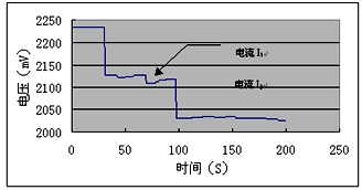 蓄電池從浮充狀態切換到放電狀態,典型的電壓跌落過程如圖2-4所示。即停止充電后,電池回落到某平衡電位,接入放電負載后,電壓發生階躍變化。這樣,內阻的計算不能使用浮充電壓和放電工作電壓的差值來計算,使用開路平衡電位與放電工作電壓的差值時也不夠穩定。因此,在放電過程改變電流可以克服平衡電位不穩定的因素。采用式(2-6),根據在不同電流(I1、I2)下的電壓變化(U1-U2)來計算內阻值。