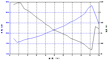 圖2-10 VRLA電池放電過程電壓、內阻曲線