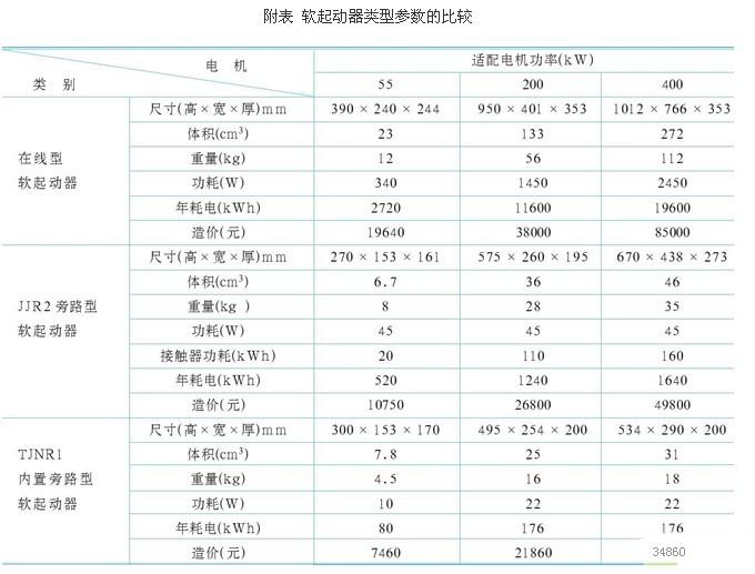 從表中可以看出,旁路型軟起動器優于在線型軟起動器,而內置旁路型軟起動器的優于旁路型和在線型軟起動器。但價格卻是越先進,成本越低,這是高科技的一般規律。以附表內舉例品牌來比較,在線型軟起動器是旁路型軟起動器的1.5倍,旁路型軟起動器的是內置旁路型軟起動器的1.4倍(不算接觸器的價格)。而能耗比較,在線型軟起動器是旁路型軟起動器的10倍左右,而旁路型軟起動器的是內置旁路型軟起動器的7倍左右。