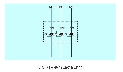 內置旁路型軟起動器(簡稱電動機控制器),顧名思義是在旁路型軟起動器內部加裝一套與晶閘管并聯的接觸器,在電機軟啟動過程和軟停車過程中由晶閘管運行,機械觸頭斷開,當電動機正常運行時晶閘管關閉,機械觸頭閉合。這套動作過程是通過內部控制器自動完成的,對外部接線來講是一個裝置,所以稱做在線運行。它又可稱作旁路型的軟啟動器將外邊的接觸器移到了軟啟動器里邊集成為一體并能保證體積不增加。它的優點是具備上述兩種類型的所有優點同時回避了它們各自的缺點:一是電路簡單;二是自然風冷;三是晶閘管只負責啟動和停車,回避了晶閘管在線運行所帶來的功耗與散熱;四是強大的智能控制器的作用得以全面發揮,能對電動機起到起停、保護及其控制;五是節省成套空間;六是由于晶閘管和機械觸頭組合一體的設計,通過智能控制器實現了機械觸頭無電弧,使得機械觸頭的電壽命等于機械壽命,解決了接觸器長期以來難以解決的問題,與旁路型軟起動器相比大大提高了接觸器的可靠性,如圖3所示。