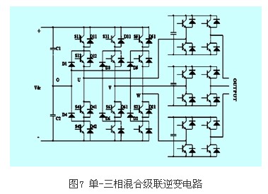 除了上述的聯(lián)結(jié)方式以外,還有由一個(gè)三相三電平二極管箝位逆變器或飛跨電容型逆變器和三個(gè)單相h橋逆變器串聯(lián)形成的三相級(jí)聯(lián)逆變器。這種電路結(jié)構(gòu)簡單,控制也易于實(shí)現(xiàn),實(shí)際中已有使用。圖7為單-三相混合級(jí)聯(lián)逆變電路圖。