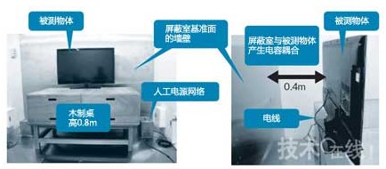 傳導(dǎo)噪聲的測(cè)量在屏蔽室內(nèi)進(jìn)行。測(cè)量條件由“CISPR16-2”或“ANSI63-4”等標(biāo)準(zhǔn)規(guī)定。兩種標(biāo)準(zhǔn)中規(guī)定,屏蔽室的基準(zhǔn)面與被測(cè)物體的距離要保持在0.4m,連接人工電源網(wǎng)絡(luò)和被測(cè)物體的電線長(zhǎng)度為0.8m,被測(cè)物體設(shè)置在高0.8m的臺(tái)子上(圖5)。