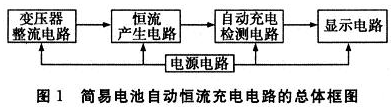 簡易電池自動恒流充電電路的總體框圖如圖1所示。它是由變壓器整流電路、恒流產生電路、自動斷電電路、顯示電路和電源電路5部分構成。