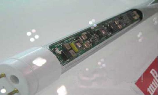 參考展示Clear Sodick生產(chǎn)的直管型LED照明產(chǎn)品,管內(nèi)內(nèi)置了電源電路,相當于40W熒光燈的產(chǎn)品的耗電量為19W,LED元件數(shù)量為204個。