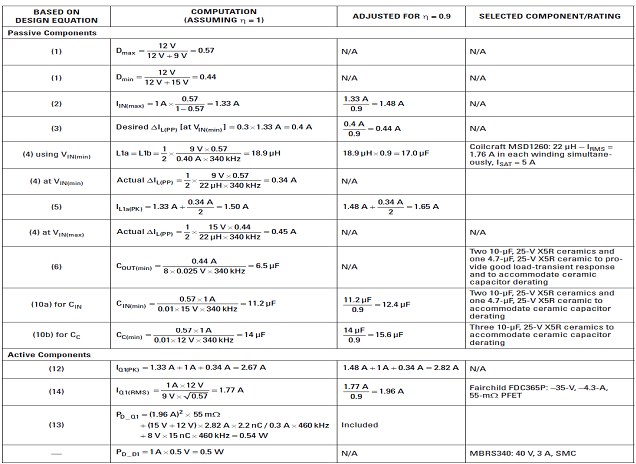 就本例而言,諸多要求都是針對一個 η= 0.9 峰值效率的 12-V、1-W 電源。負載為穩態,因此幾乎看不到負載瞬態。2-A 輸入電源為 9 到 15V。我們選擇了異步電壓模式控制器即 TI TPS40200,其工作在 340 和 460kHz 之間的開關頻率下。輸入端和快速電容器的最大允許紋波分別為彼此交叉最大電壓的 1%。最大輸出紋波為 25 mV,而最大環境溫度為 55ºC。由于 EMI 并不是問題,通過使用最小輸入電壓,我們選擇了具有更低電感值的電感。下一頁的表 1 概括了前面介紹的一些設計計算方法。我們忽略了方程式 7 到 9 以及方程式 11,因為使用了高 RMS 電流額定值的低 ESR 陶瓷電容。