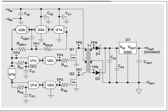 如果應用要求 2 kV 以上的隔離電壓、60% 以上的轉換器效率或者標準組件可靠的有效性,那么分立設計就是一種能夠替代集成組件的低成本方案。分立 DC/DC 轉換器設計的缺點是需要做大量的工作——選擇穩(wěn)定的振蕩器結構和先斷后通電路,選擇可以通過標準邏輯門有效驅動的MOSFET,適宜實施溫度和長期可靠性測試。所有這些努力都要花費時間和資金。因此,在倉促進行這樣一個計劃以前,設計人員應該考慮到下列事項:集成組件通常已通過溫度測試,并且擁有其他工業(yè)資質。這些組件不僅僅是最可靠的解決方案,而且還擁有較快的上市時間。
