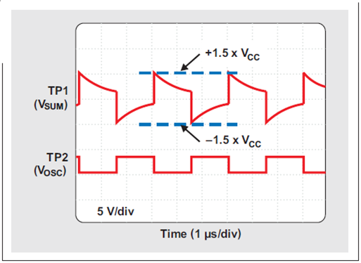 著名的三反相門振蕩器由 U1a、U2a 和 U2b 組成,選擇它是因為它在供電波動方面較為穩(wěn)定。通過一個 100-pF 陶瓷電容器(COSC)和兩個 10-kΩ 電阻器(ROSC1 和 ROSC2),它的正常頻率被設定為 330kHz。在 3.0-V 到 3.6-V 電源電壓波動范圍內,振蕩器擁有接近 50% 的占空比,以及低于 ±1.5% 的最大頻率波動。圖 2 顯示了 ROSC1 和 ROSC2 (TP1) 相加點和振蕩器輸出 (TP2) 處的波形。所有電壓均為參考電路基準電壓測得。[page]