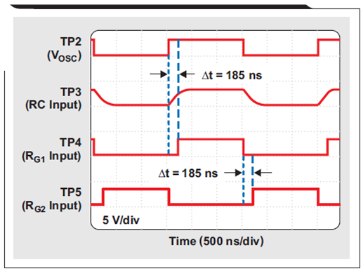 施密特觸發(fā)電路 NAND 柵極(U1c、U1d)實現先斷后通功能,以避免 MOSFET 導通階段交疊。其他兩個NAND門(U2c,U2d)配置為反相緩沖器,從而產生驅動 N 通道 MOSFET(Q1、Q2)必需的正確信號極性。圖 3 顯示了完整的先斷后通動作。為了適應標準邏輯門的有限驅動能力,我們選擇了 MOSFET,因為其較低的總電荷和較短的響應時間。