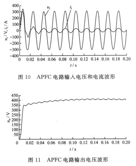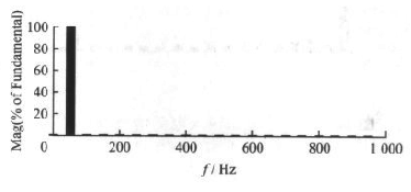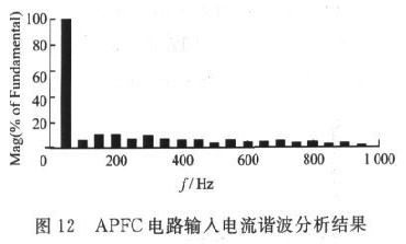 單相APFC電路采用Matlab7.6進行建模與仿真。圖10為APFC電路輸入電壓和電流波形,可見網側輸入電流由窄脈沖波形變成正弦電流波形,且與輸入電壓同相位。圖11為APFC電路輸出電壓波形,可見經過60ms的軟啟動過程之后,輸出電壓穩定在400V左右,滿足設計要求。圖12為APFC電路輸入電流諧波分析結果,可見除基波外,其余諧波含量均很小?! ?/p>
