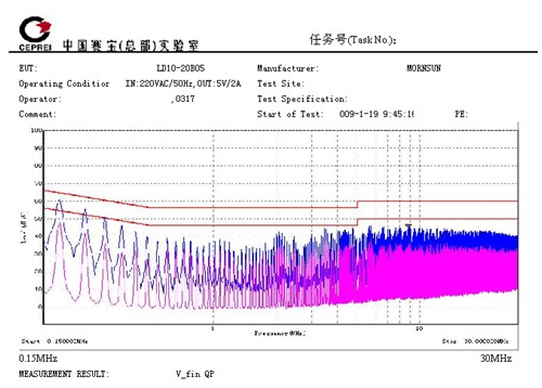 5. 具有較低的EMI性能。EN55011有level B,level A兩個等級,level B比level A嚴苛得多。圖2、圖3是LD10產品的EMI測試數據,該數據由國家電子五所專業測試。測試結果可以看出,該系列電源具有較低的電磁輻射性能,達到EN55011,level B的要求。