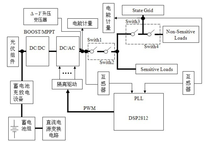 正常工作時,開關Switch1、Switch2、Switch3、Switch4 同時閉合,為當地負荷提供電能;當電網缺相、電壓嚴重跌落等非正常狀況時,由DSP 檢測出異常情況,做出判斷決策,并控制開關的開通與關斷。這時,開通Switch1 和Switch2,關斷Switch3,保證重要負荷的供電。當逆變器發生故障時,立即斷開Switch1,逆變器退出,同時斷開Switch4,由電網 對重要負荷供電。當逆變器故障消失時,再與電網同步后,開通Switch1,在閉合Switch4。恢復對當地負荷的供電。當需要檢修逆變器時,先斷開開 關Switch2,檢修完成后,重新閉合Switch2。
