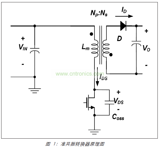 與共振電路在轉換過程中發揮積極作用的共振拓撲不同,準共振拓撲僅實施軟換向過程。圖 1 中顯示準共振返馳式轉換器的簡化圖表。這種拓撲與常規方波 PWM 返馳式轉換器具有明確的相似之處,其中 MOSFET 輸出電容器 (Coss) 表示漏極節點的總電容。