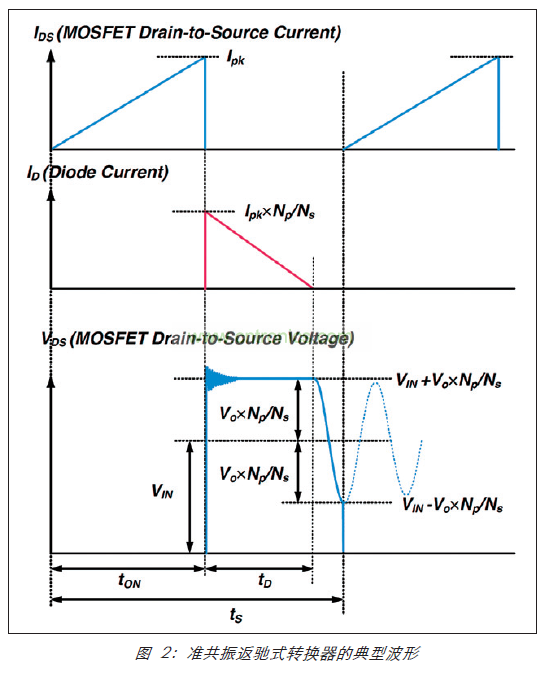 圖 2 顯示準共振返馳式轉換器的典型波形。如果二極管電流在 MOSFET 關閉后達到零,則 MOSFET VDS 會由于原邊電感器 (Lm) 與 MOSFET 輸出電容器 Coss 之間的共振而開始振蕩。在 VDS 達到其最小值時(因漏極與源極之間的電容負載,降低 MOSFET 導通開關損耗),通過開啟 MOSFET 來實現準共振交換。設計變壓器匝數比 Np/Ns,以便共振振幅大于 VIN,從而使零電壓開關 MOSFET 能夠實現。