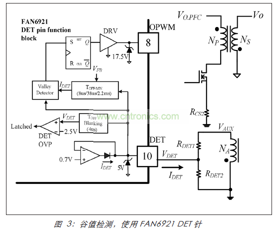 首次進行準共振轉換器設計之前,在前面所述的應用說明的幫助下,了解將面臨的主要問題是一件非常值得的事情。正如討論的那樣,可靠檢測 MOSFET 電壓谷值是準共振轉換器操作中的要素。某些 PWM 轉換器實施此功能要比其他轉換器做得更好,因此在評價競爭對手的設備時,務必留意這一點。例如,圖 3 顯示使用 Fairchild FAN6921 PWM 控制器的谷值檢測電路的典型應用。通過監視流出谷值檢測針 (DET) 的電流來檢測MOSFET的電壓谷值;當流出檢測針的電流超過30μA 時,將觸發該電路。這是特別有吸引力的解決方案,因為它只需要一個變壓器輔助線圈和兩個電阻。