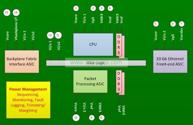 在圖1所示的線卡中,有四個(gè)主要的集成電路和一些粘合邏輯。每個(gè)集成電路都需要多個(gè)電源,并有定序的要求。這塊電路板有14個(gè)電源電壓,需要進(jìn)行監(jiān)測(cè)、定序、微調(diào)和裕度調(diào)整。此外,電路板的設(shè)計(jì)還需要將任何意想不到的電源故障記錄在非易失性存儲(chǔ)器中。