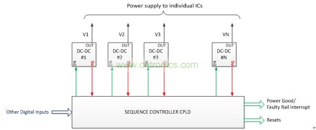 一個(gè)實(shí)現(xiàn)復(fù)雜的電源管理的常用方法(圖2)是使用DC-DC轉(zhuǎn)換器的電源良好信號(hào),以監(jiān)測(cè)這個(gè)電源,并使用CPLD來實(shí)現(xiàn)定序算法(控制DC-DC轉(zhuǎn)換器的使能信號(hào))。CPLD也產(chǎn)生監(jiān)測(cè)信號(hào),如電源就緒/故障電壓中斷和復(fù)位信號(hào)。