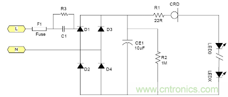 C1為降壓電容器, D1, 2, 3, 4為橋式整流二極管, ZD1是穩(wěn)壓二極管, R1為關斷電源后C1的電荷泄放電阻。