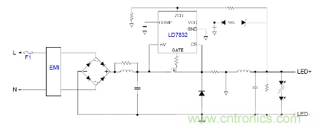 隨著目前法規(guī)和能效的需求, 針對LED應用提出高PF以及適應全電壓范圍都能可靠工作的要求, 并且朝小型化方面發(fā)展, 因此之前的填谷式的PFC電路也需要增加兩個高壓電容因體積的限制不太適合應用。有鑒如此, 國內外很多廠商都推出了適應球泡燈和T管之類的非隔離電源應用驅動方案, 下面就以通嘉科技的LD7832做為典型介紹。