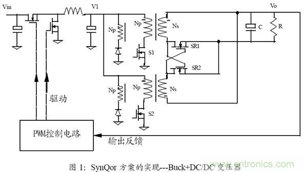 標(biāo)準(zhǔn)DC/DC 二次電源(半磚,1/4 磚)模塊,采用了Buck 與DC/DC 變壓器相級聯(lián)的兩級電路方案,如圖(1)所示。初初一看,這個方案比單級方案(如有源箝位正激電路)的元器件數(shù)要多,不太合理。但通過分析,可以發(fā)現(xiàn):其功率器件的總數(shù)并沒有增加(因為在低壓大電流輸出的應(yīng)用場合,輸出同步整流MOSFET 即使在單級方案中也要多個并聯(lián)才能實現(xiàn)效率指標(biāo));磁芯和電容元件的總面積也沒有增加(因為可以用更小的磁芯和電容)。但由于兩級方案容易優(yōu)化和設(shè)計,故模塊的電氣性能得到了極大的改善,具體分析見下面的介紹。
