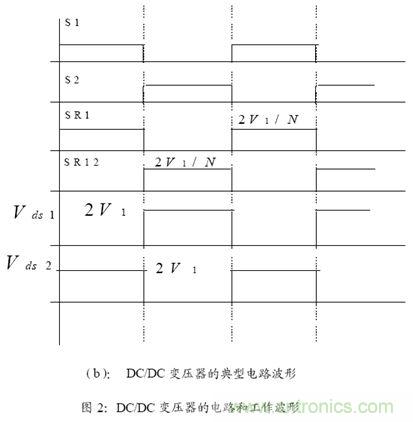 這個方案的第一級是一個同步整流Buck 變換器,它將不穩(wěn)定的輸入電壓,調(diào)整到后級DC/DC 變壓器所合適的輸入電壓,通過反饋輸出和誤差放大等,去控制Buck 變換器的PWM占空比,從而穩(wěn)定輸出。DC/DC 變壓器的電路和工作波形如圖2 所示: