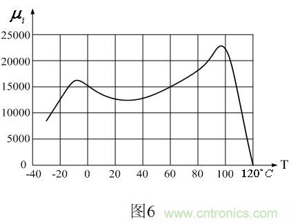 圖6是日本TDK公司高導(dǎo)磁率材料H5C4系列磁芯初始導(dǎo)磁率 隨溫度變化的曲線圖,其居里溫度大約為105℃。