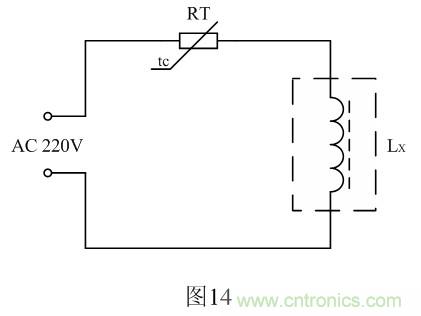 開(kāi)關(guān)變壓器退磁的最好的方法是讓開(kāi)關(guān)變壓器初級(jí)線圈在非常短的時(shí)間內(nèi)通過(guò)一個(gè)幅度為3~5倍Imax(極限電流)的阻尼振蕩電流。因此,可用一個(gè)20~40歐姆的消磁熱敏電阻(可用兩個(gè)消磁熱敏電阻串聯(lián))與開(kāi)關(guān)變壓器的初級(jí)線圈串聯(lián),然后接到110~220V/50Hz交流電源上,大約只需要20多秒鐘,待消磁熱敏電阻完全加熱后,即可達(dá)到退磁的目的,如圖14所示。在圖14中,RT為熱敏電阻,Lx為開(kāi)關(guān)變壓器的初級(jí)線圈。