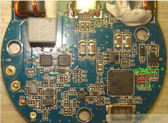 接著,把點金石電路板上的線引出來,并把中間三腳短接。這里忘了拍照,引用segara大神的圖。或者也可以按照segara的方法短接R62、R63和第三腳D+