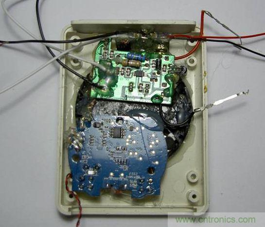 在這里我還在上蓋上鉆了兩個小孔制作了指示燈。我找了一直圓珠筆,筆桿是那種硬硬的透明的PE材料,我用電磨磨出剛好穿過小孔的細條,用打火機小心彎曲,把細條的另一端貼住電路板上的LED,將指示燈的燈光引到上蓋外面。然后用油料(橡皮泥)或者電工膠布包住led和細條,防止燈光干擾。最后用指甲銼將上蓋外突出來的筆桿銼平,用木片拋光,一切都很完美。可惜制作的過程忘記照相了,還好下文可以看到做好的效果。