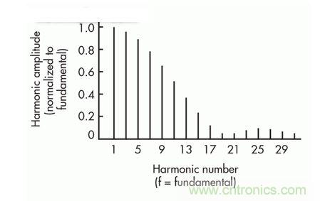 非線性負(fù)載可使諧波大小與線路頻率下的基本諧波電流具有可比性。圖4顯示了相對(duì)于線路頻率下的基本諧波大小進(jìn)行標(biāo)準(zhǔn)化的高階諧波電流大小。不過(guò),只有圖1中給出的在與線路頻率相同的頻率下且與電源線電壓同相的諧波電流(在此案例中為線路頻率下的基本諧波)對(duì)提供給負(fù)載的平均功率起作用。這些諧波電流會(huì)影響同一電力線上的其他設(shè)備的工作情況。