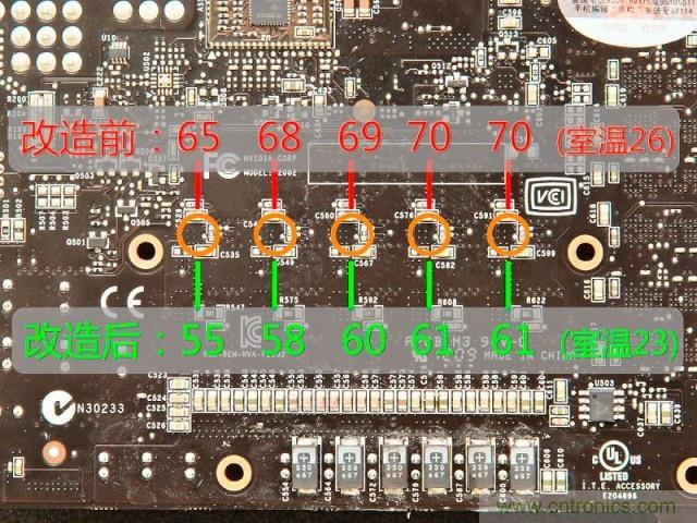 看下改造前后的供電模塊溫度吧,使用紅外測溫槍對準供PCB背面供電模塊的位置分別取5個測量點,測試使用FC2的benchmark tool連續(xù)運行25分鐘后進行溫度采集。沒有空調(diào),室溫不固定,沒有辦法,不過還是能看出改造后供電模塊的溫度的確有明顯的下降,刨去室溫的差距后應該還能有5度以上的溫差。另外溫度的下降在另一個方面說明供電模塊的效率提升,只是忙著改造忘記在之前測一下功率了,個人感覺應該能省5瓦左右的功率吧。
