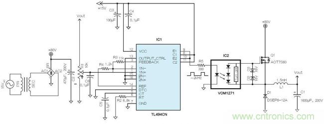 這里嘗試在開關穩壓器中使用了光電耦合器(VOM1271),該耦合器具有一個內置的快速關斷器件。如果將200pF柵極電容連接至IC2,則開關時間(ton與toff)分別為53μs和24μs。有鑒于此,降壓轉換器選擇了2kHz的開關頻率。此處選用了德州儀器(TI)的TL494(IC1)作為脈沖調制控制器。