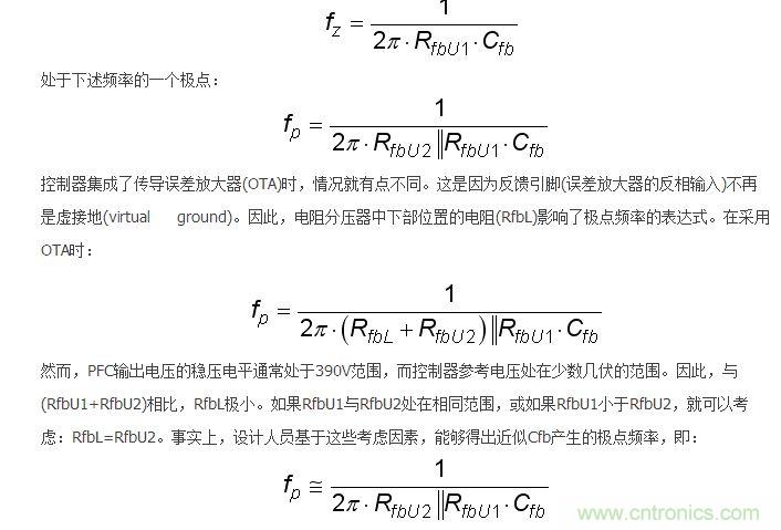 如果RfbU1與RfbU2處在相同范圍,低頻增益就略微增加,交越頻率就跟隨fp與fz的相同比率增加。如果與RfbU2相比RfbU1極小,我們就獲得在控制至輸出傳遞函數(shù)中抵消(cancel)的極點和零點。這樣,增加Cfb就對環(huán)路和交越頻率沒有影響。事實上,特別是在RfbL=RfbU2時,這個增加的電容并不會大幅改變PFC段的動態(tài)性能。