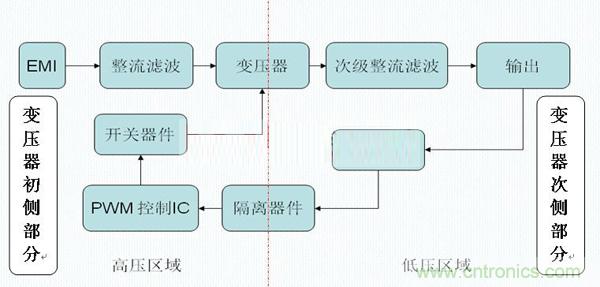 一般來說,總的來分按變壓器初測部分和次側(cè)部分來說明。開關(guān)電源的電路包括以下幾個(gè)主要組成部分,如圖1