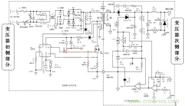 圖2是反激式開關(guān)電源的原理圖,就是在圖1框圖的基礎(chǔ)上,對各個(gè)部分進(jìn)行詳細(xì)的設(shè)計(jì),當(dāng)然,這些設(shè)計(jì)都是按照一定步驟進(jìn)行的。下面會(huì)根據(jù)這個(gè)原理圖進(jìn)行各個(gè)部分的設(shè)計(jì)說明。
