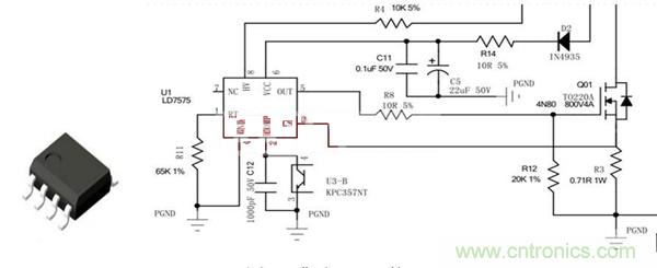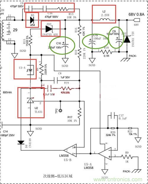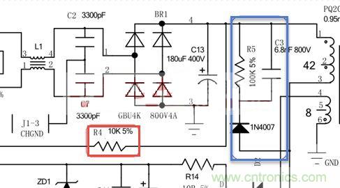 紅線圈起的電阻為I C的高壓啟動(dòng)電阻,電阻阻值的選擇由IC特性決定。