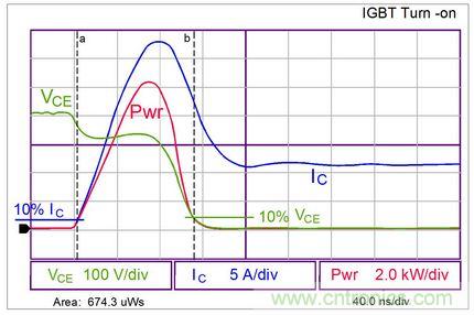 導通時,應當量測起于IC電平10%終于10% VCE點的損耗。這些電平等級相當標準,雖然這樣說也有些主觀性。如果需要的話,也可以使用其他點。無論選擇何種電平來量測不同間隔,重要的是保持一致,使從不同 組件獲取的數據能夠根據相同的條件來比較。功率根據示波器波形來計算。由于它并非恒定不變,且要求平均功率,就必須計算電源波形的積分,如波形跡線的底部 所示,本案例中為674.3 μW(或焦耳)。