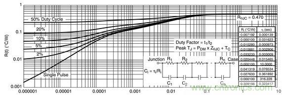 安森美半導體IGBT組件的數據表中包含IGBT及二極管θ值圖表。穩態θ值如圖7及圖8中的圖表所示。IGBT的θ值為0.470 °C/W,二極管為1.06 °C/W。計算中還要求另一項熱系數,即兩個裸片之間的熱交互影響常數ψ。測試顯示對于TO-247、TO-220及類似封裝而言,此常數約為0.15 °C/W,下面的示例中將使用此常數。