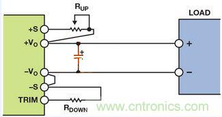 輸出電壓可通過(guò)改變連接電源模塊正輸出端或接地端的電阻來(lái)進(jìn)行調(diào)節(jié)通過(guò)連接外部電阻RUP并使RDOWN浮空,可以向上調(diào)整輸出電壓(高于標(biāo)稱輸出電壓),或者通過(guò)連接外部電阻RDOWN并使RUP短路(電阻值為零)向下調(diào)整(低于標(biāo)稱輸出電壓)。