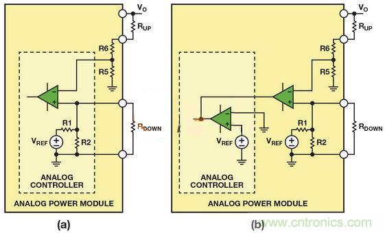 (b)帶有固定內(nèi)部基準(zhǔn)電壓的模擬控制器調(diào)整模擬電源模塊的輸出電壓