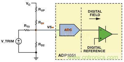 VS+引腳上的正常工作電壓為1V。若 VTRIM為1V左右且RT0遠(yuǎn)大于RD2,則可忽略電路的其余分支部分。復(fù)合網(wǎng)絡(luò)用作簡(jiǎn)單分壓器,并調(diào)節(jié)RUP電阻值,提供類(lèi)似于模擬控制器的特性,實(shí)現(xiàn)了模擬電源模塊中的電壓向上調(diào)整。
