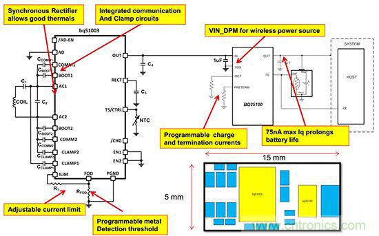 所幸的是,無線充電并沒有那么大的技術(shù)障礙,市面上已經(jīng)有了很多可行的方案出現(xiàn),當(dāng)前TI也順勢推出了適用于可穿戴設(shè)備的無線充電解決方案,在該方案的接收模塊上,我們可以看到除了應(yīng)用了上述所提及的降壓轉(zhuǎn)換器Bq25100外,還加入了基于Qi標(biāo)準(zhǔn)的無線充電接收器——BQ51003($1.4625)。