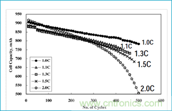 這是關(guān)于鋰離子電池充放電速率與其容量和循環(huán)壽命的關(guān)系圖,縱軸代表容量,橫軸代表循環(huán)壽命,由不同的點(diǎn)所描繪出來(lái)的曲線代表了用不同的速率對(duì)電池進(jìn)行充放電時(shí)容量與循環(huán)壽命之間的關(guān)系。其中的C是與電池的容量有關(guān)的充放電速率數(shù)據(jù),假設(shè)某個(gè)電池的容量為1000mAH,如果用1000mA的電流對(duì)它進(jìn)行充電或放電,則充滿或放完其全部電能的時(shí)間是一個(gè)小時(shí),這時(shí)候的C就代表1000mA,2C則代表2000mA。根據(jù)這些定義,這個(gè)圖告訴我們?nèi)缦滦畔ⅲ哼@個(gè)電池的初始容量為900mAH,假如用1C即900mA的電流對(duì)它進(jìn)行充放電,經(jīng)過(guò)500個(gè)循環(huán)后,其容量還剩下大約780mAH;如果用2C即1800mA的電流對(duì)它進(jìn)行充放電,則經(jīng)過(guò)500個(gè)循環(huán)后,其容量會(huì)下降到大約500mAH。